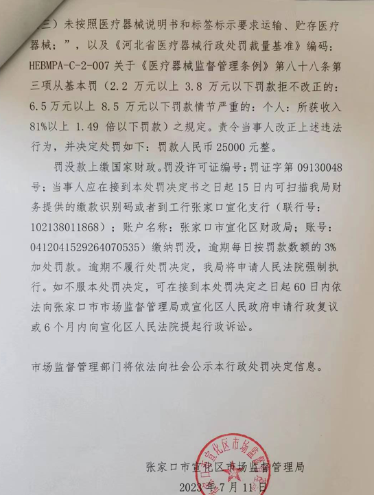 未按要求贮存医疗器械,河北北方学院附属第二医院被罚2.5万 2023-12-04 寻医问药 18588 作者:贝莱孕育 张家口市宣化区人民政府网站19日发布行政处罚信息,河北北方学院附属第二医院未按说明书和标签标示要求贮存医疗器械被罚款2.5万元。行政处罚决定书如下: